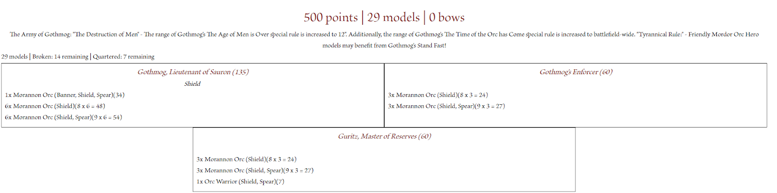 I really wanted to try Gondor against anything OTHER than Rivendell, and Andrew obliged with some Gothmog’s Legion action. I took the same list I've been running for a bit. Lords of Battle is one that hasn't come up in a long time! Maybe ever on this blog?? We veto’d Storm the Camp and Heirloom of Ages Past.